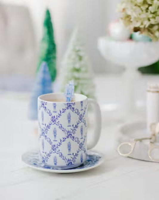 Grandmillennial Blue and White Nutcracker Mug - Trellis Watercolor Design