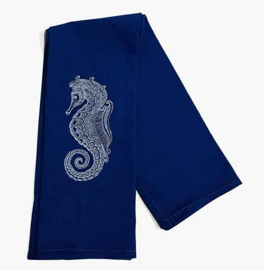 Embroidered Chinoiserie Coastal Seahorse Tea Towel in Blue